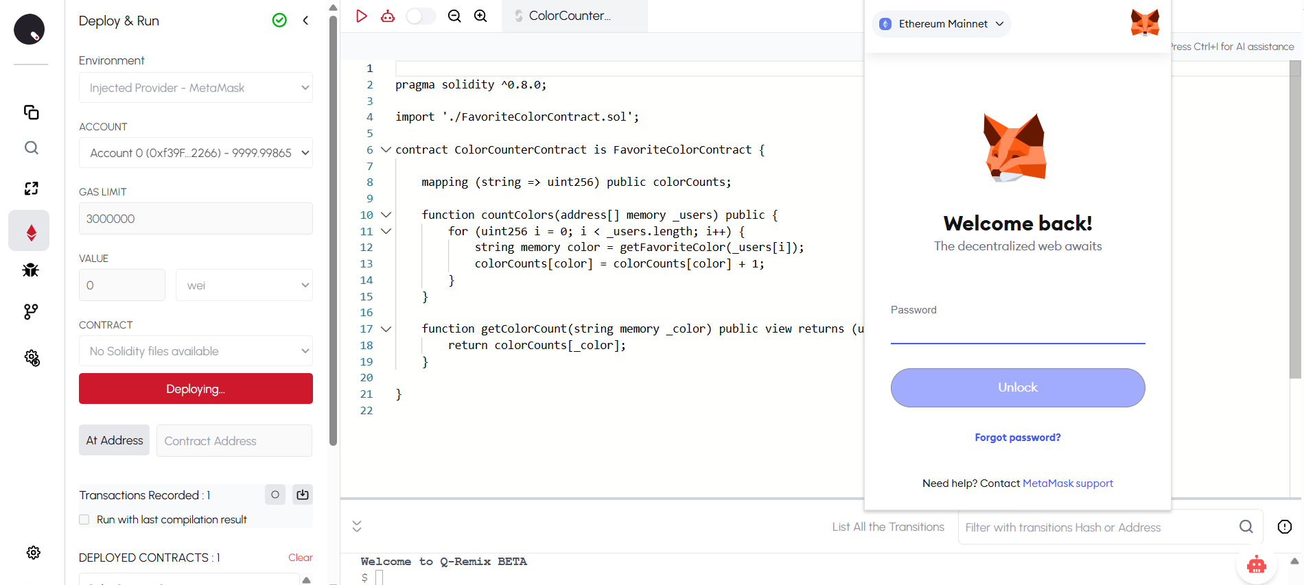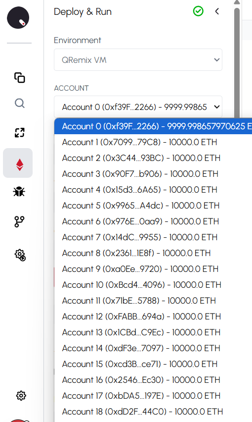 Q-Remix VM: Uses Hardhat to generate 10 test addresses with 10,000 ETHs in each address. The user can switch the addresses anytime and test or deploy with them. The states of each of the contracts remain the same even after refreshing the entire page. This ensures that no progress made is lost during the session. However, if the session is closed all the accounts are reset to have the original 10,000 ETHs.